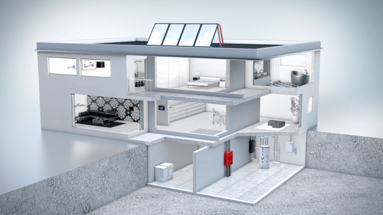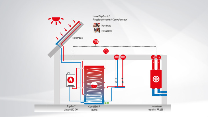 Une solution complète qui inclut différentes sources d’énergie, n’est pas forcément coûteuse. Mais elle requiert le savoir-faire d’un spécialiste pour que les différents composants soient parfaitement adaptés les uns aux autres. La solution complète pour votre maison individuelle neuve ou pour remplacer votre chauffage peut par exemple se composer de capteurs solaires thermiques UltraSol et d’une chaudière à gaz à condensation murale TopGas classic. Une ventilation confort HomeVent comfort FRT complète votre système. Si votre construction nouvelle est bien isolée, un échange d’air régulier est nécessaire.