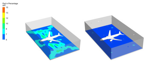 Selon l'étude comparative réalisée par SOLCI-CAD, en observant les contours du PPD (pourcentage de personnes insatisfaites) observé dans un hall industriel de 30m de hauteur dans un plan à 1,75m du sol, on visualise que la solution de chauffage industriel Hoval par injection d’air avec diffuseur à pulsion giratoire (figure de droite) est meilleure que le chauffage par panneaux rayonnants (figure de gauche) car le confort thermique est homogène dans tout le hangar.