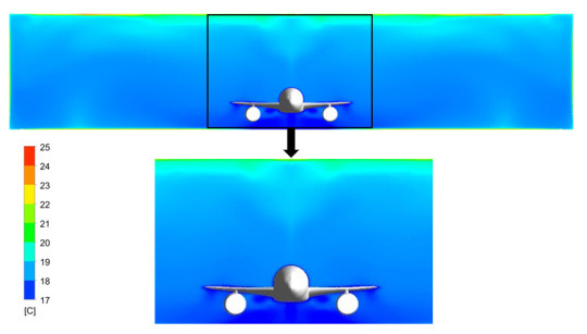 On observe également un phénomène d’ombrage caractérisé ici par la variation de température : une zone de plus faible température correspond à une zone plus ombragée, située en dessous de l'avion qui fait figure d'obstacle à une diffusion homogène de la chaleur.