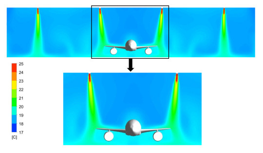 On observe que la température de l'air pulsé par les aérothermes Hoval TopVent équipés du diffuseur à pulsion giratoire Air-Injector s'homogénéise progressivement dans le volume d'air global, y compris sous l'avion. En effet, le brassage d'air qui s'opère avec une technologie de soufflage permet d'atteindre une température confortable, même sous un obstacle.