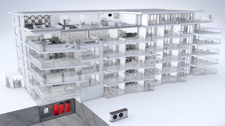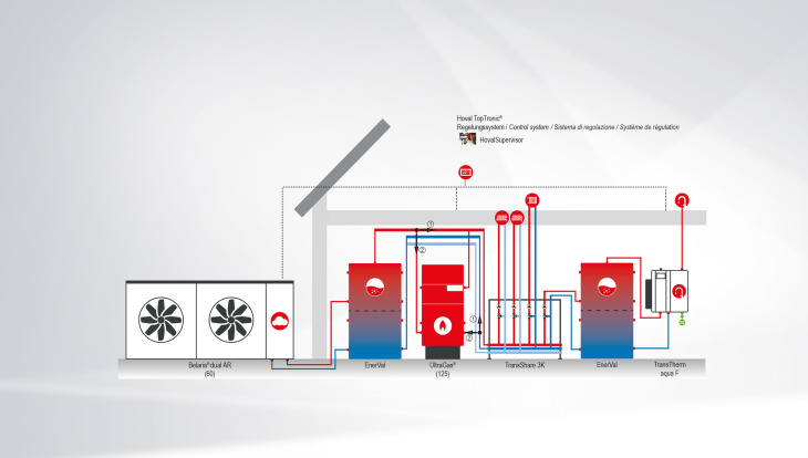 En tant qu’investisseur, cette solution devrait vous intéresser si vous devez rénover une maison multifamiliale. Une chaudière à gaz très efficace UltraGas forme une unité avec la pompe à chaleur air/eau Belaria dual AR (60). Avec une puissance de 60 kW, elle est actuellement le seul appareil de ce type à pouvoir chauffer un grand bâtiment. La pompe à chaleur couvre la plage de basses températures, la chaudière à gaz couvre la plage de hautes températures et les pics de consommation. Vous profitez ainsi de deux avantages à la fois: Sécurité de fonctionnement et énergie en partie renouvelable. Effet supplémentaire cool: la pompe à chaleur peut également refroidir.