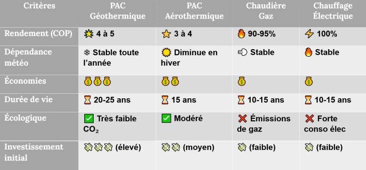 - Fiabilité et durabilité : les températures stables du sous-sol assurent un fonctionnement constant et prévisible, réduisant l'usure des composants et prolongeant la durée de vie de l'installation. Une PAC géothermique dure en moyenne 20 à 25 ans, contre 15 ans pour une PAC aérothermique et 10 à 15 ans pour une chaudière à gaz.