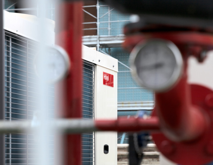 Le projet de rénovation consistait à remplacer les deux générateurs desservant les systèmes de chauffage et d'eau chaude par un nouveau système hybride Hoval composé de cinq pompes à chaleur Belaria fit (85) associées à deux chaudières gaz à condensation UltraGas 2 D (1240), le tout géré par un système de régulation unique.